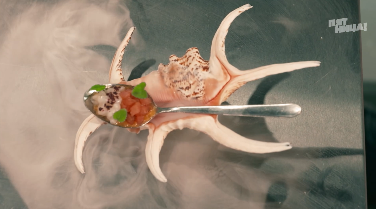 На седьмом этапе ключевыми были необычные тарелки, под которые требовалось приготовить блюдо. Якубову выпала ракушка, и он подал в ней тартар из гребешка и тунца. Константин Ивлев лишь попробовал угощение и ушёл, но ангарчанин прошёл дальше.