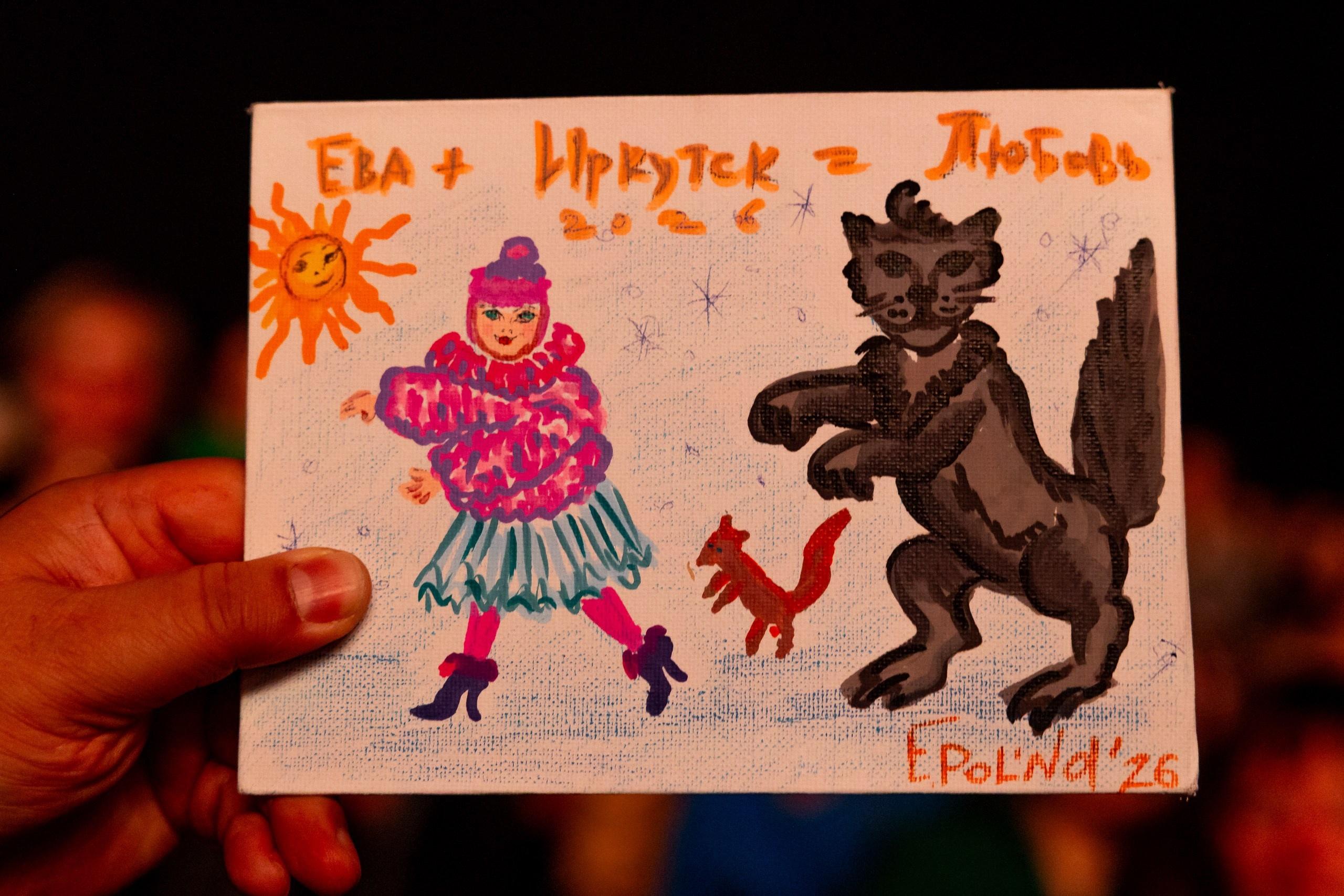 После концерта артистке вручили открытку с рисунком. На ней изображены сама Ева, бабр — символ Иркутска, а также соболь. Сверху размещена надпись: «Ева + Иркутск = любовь».