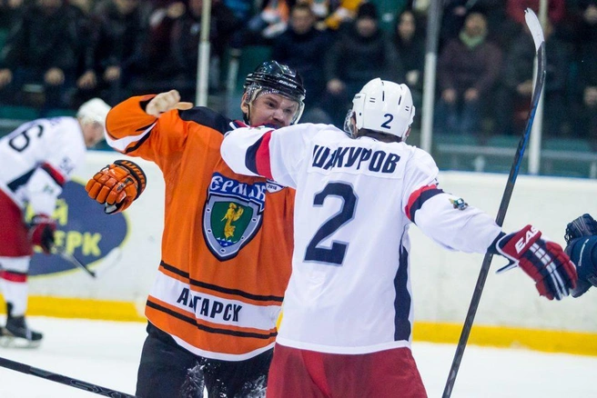 Ангарский «Ермак» дошёл до четвертьфинала плей-офф Высшей хоккейной лиги. На фото хоккеист Олег Приданников в напряжённом моменте игры.