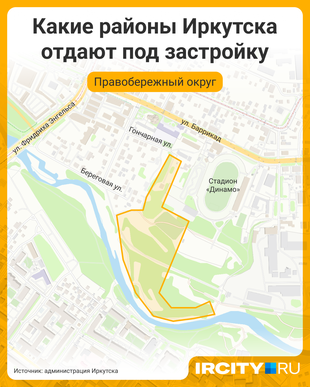 Администрация Иркутска обнародовала планы по комплексному развитию новой территории в предместье Рабочем. Основной акцент сделан не на жилищном строительстве, а на создании набережной с велопешеходным мостом через реку Ушаковку, который соединит район с улицей 3-й Красноказачьей. Соответствующие документы размещены на официальном сайте мэрии.