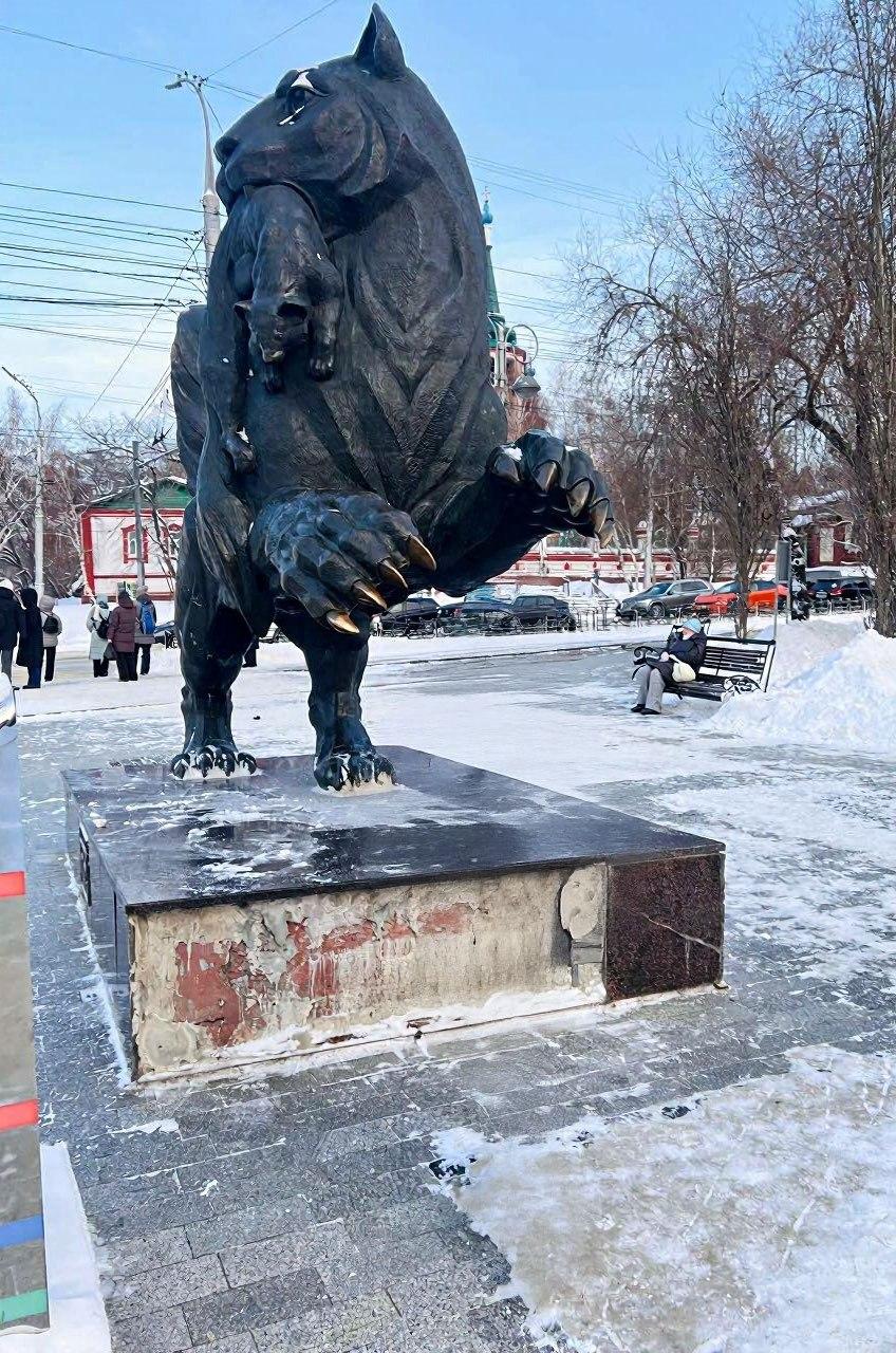 Ещё в декабре покрытие постамента находилось в полной сохранности. Это подтверждают фотографии, сделанные горожанами у скульптуры, которая перед Новым годом была украшена шарфом от волонтёров приюта «Время котов».