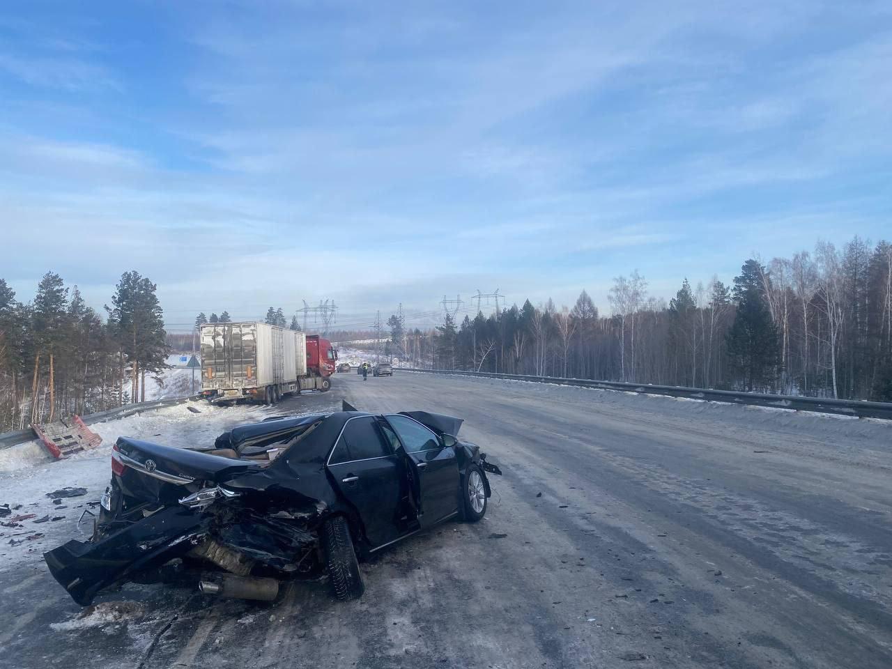 Столкновение случилось в 13:30 на 29-м километре автодороги Р-258 «Байкал». По предварительным данным, грузовик под управлением 45-летнего мужчины двигался в направлении Иркутска, когда водитель потерял контроль, оказался на полосе встречного движения и совершил лобовое столкновение с автомобилем Toyota Camry.