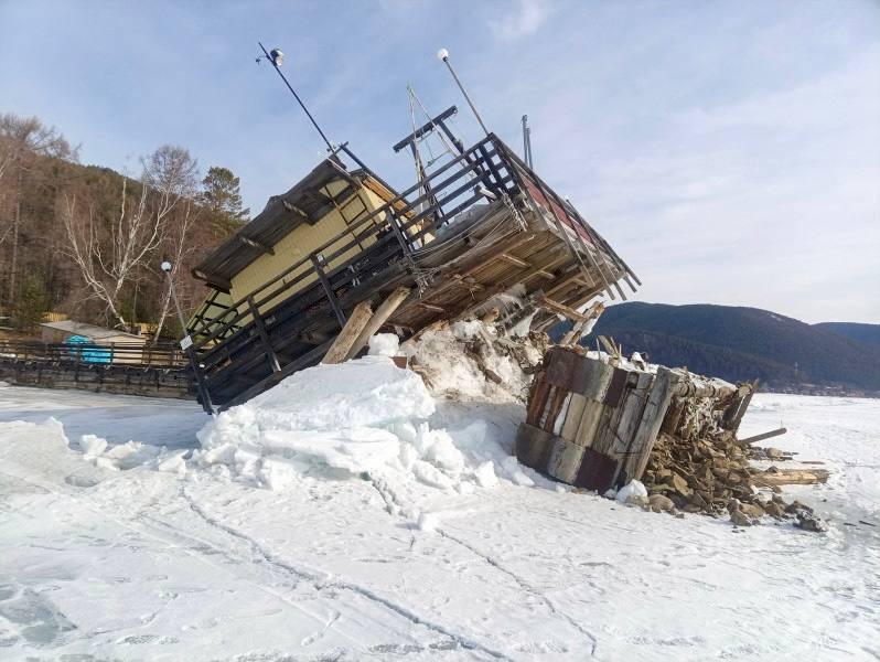 Крупная трещина во льду Байкала привела к повреждению причала Лимнологического института в поселке Большие Коты. Конструкцию с домиками выдвинуло на берег.