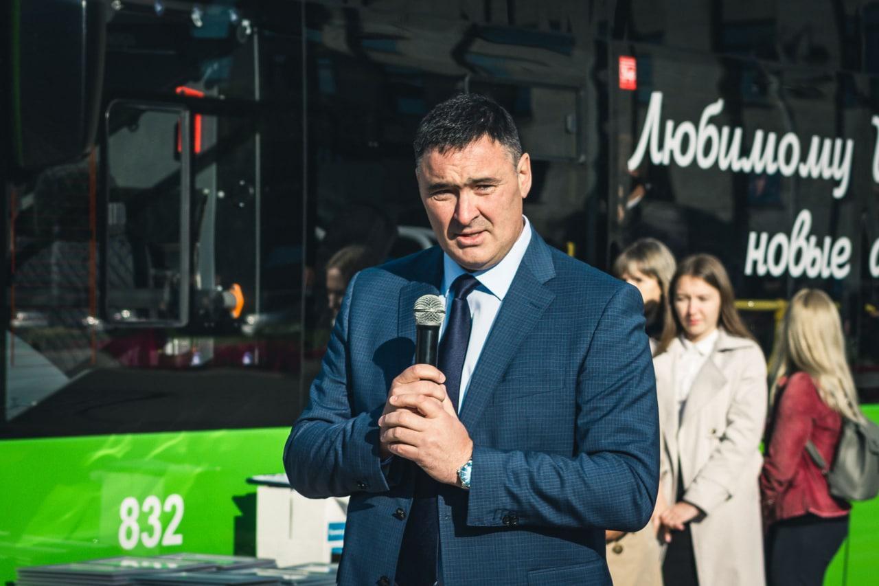 Мэр Иркутска Руслан Болотов на фоне муниципального автобуса. Проезд в таком транспорте подорожает с 1 января 2026 года.