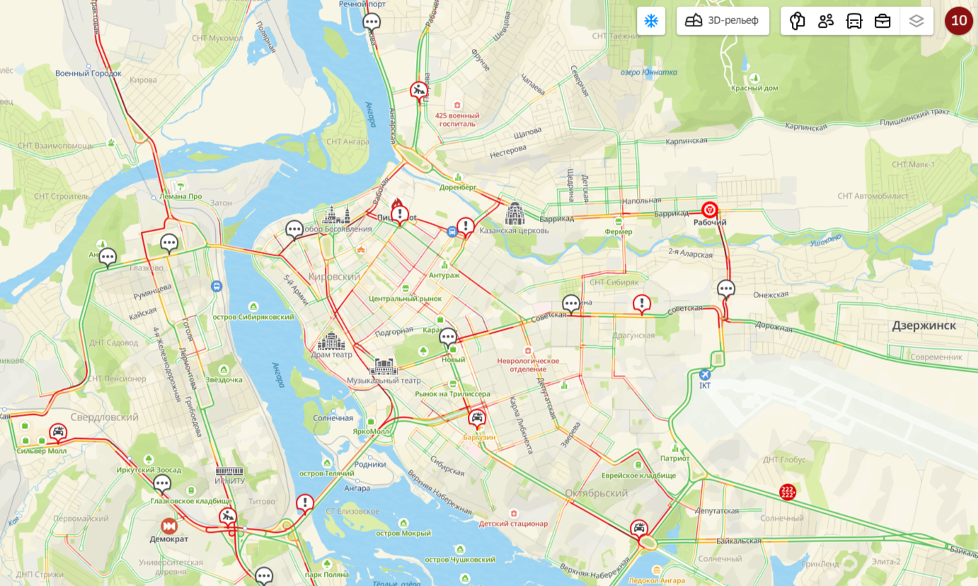 В центре Иркутска практически все улицы отмечены на картах как перегруженные, с цветовой индикацией от оранжевого до бордового. В частности, пробки собираются на Советской и Байкальской.