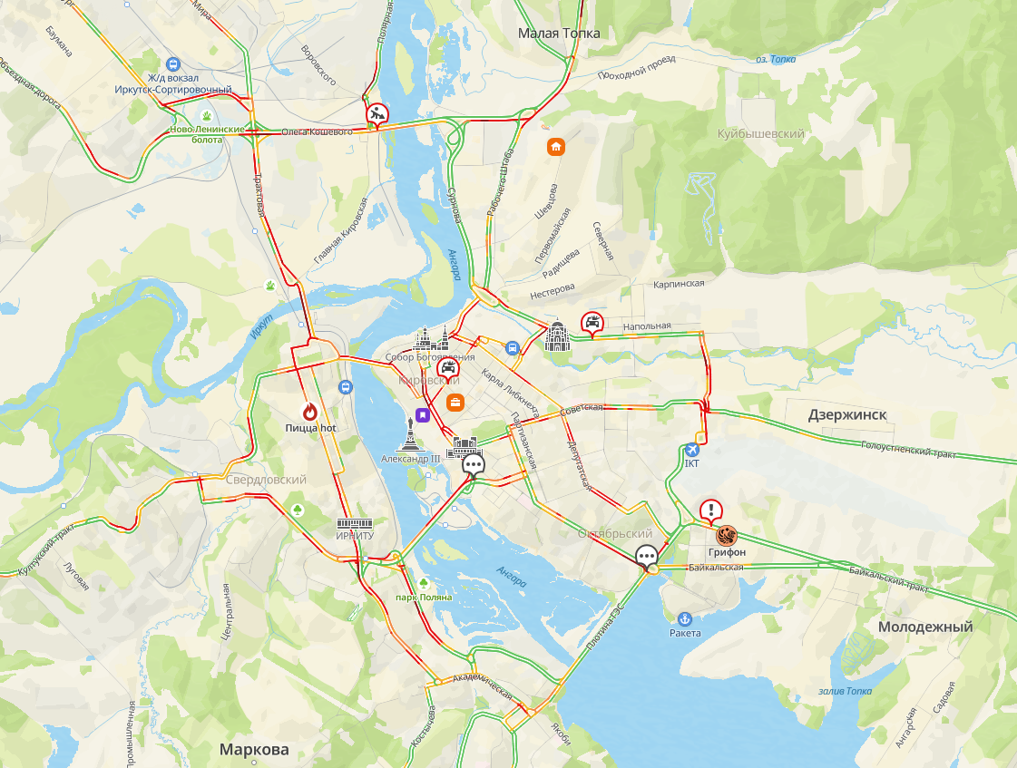 Движение затруднено и в Свердловском округе. Пробки возникли на объездной дороге микрорайонов Университетский и Первомайский, на улицах Лермонтова и Старо-Кузьмихинской. Затруднен выезд из города на Култукский тракт.